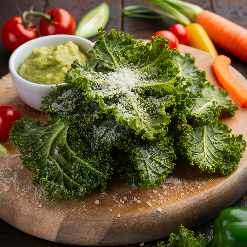 Por qué es bueno: Los chips de kale son bajos en calorías y altos en nutrientes, como la vitamina K, A y C. Son una opción deliciosa y saludable para satisfacer los antojos de algo crujiente.