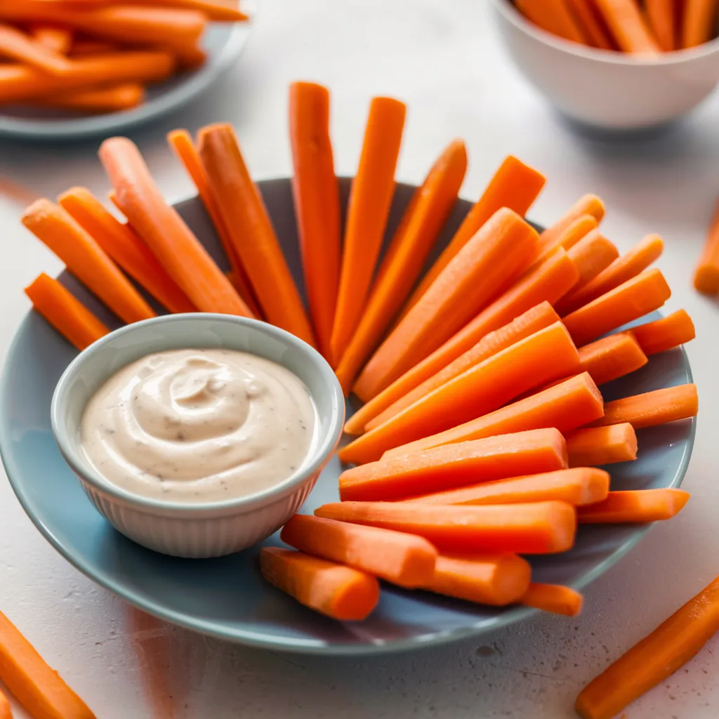 Por qué es bueno: Las zanahorias son bajas en calorías y ricas en vitamina A y fibra. El dip de yogur añade un toque cremoso y proteico.