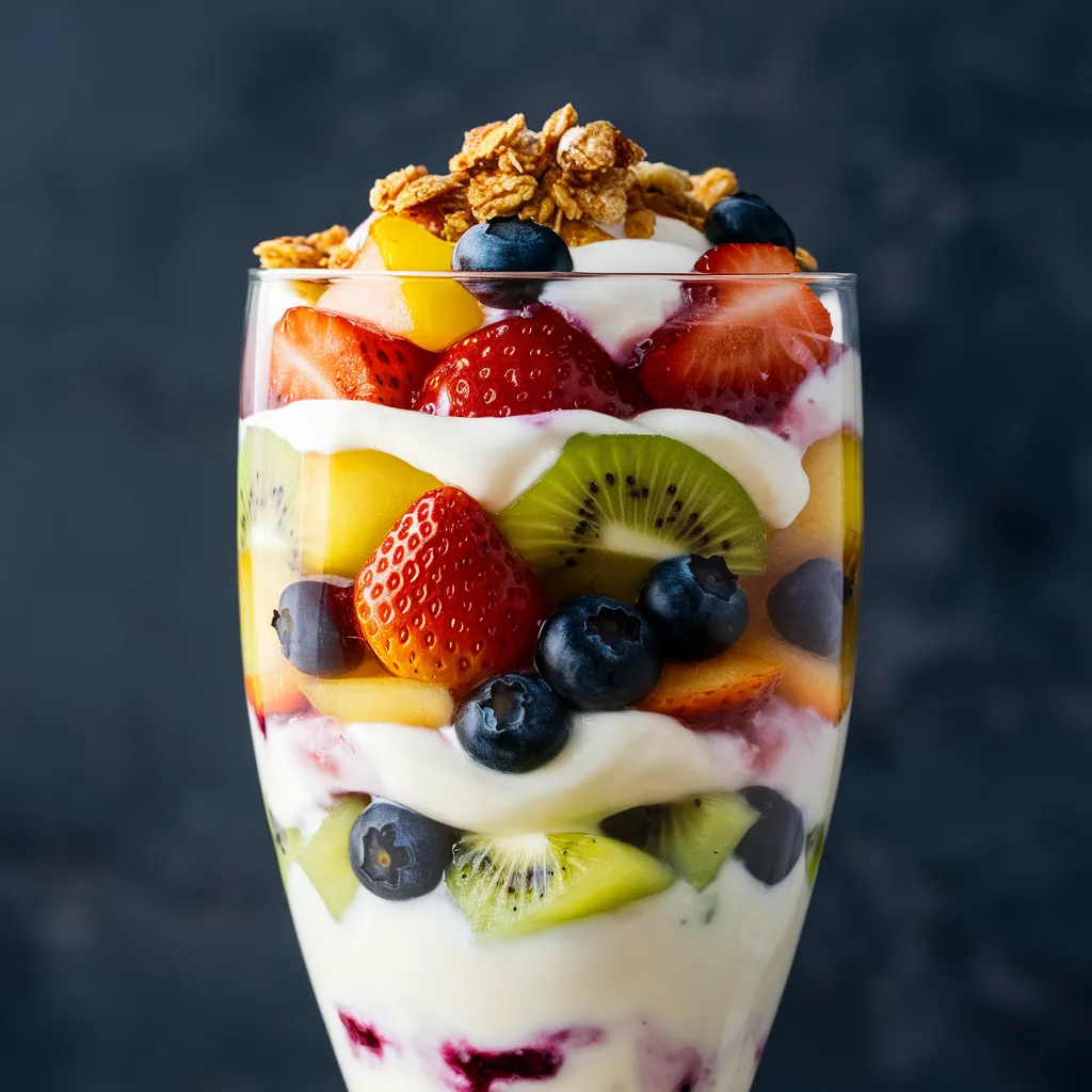 Un parfait ligero y delicioso, lleno de capas de yogur, frutas y granola.