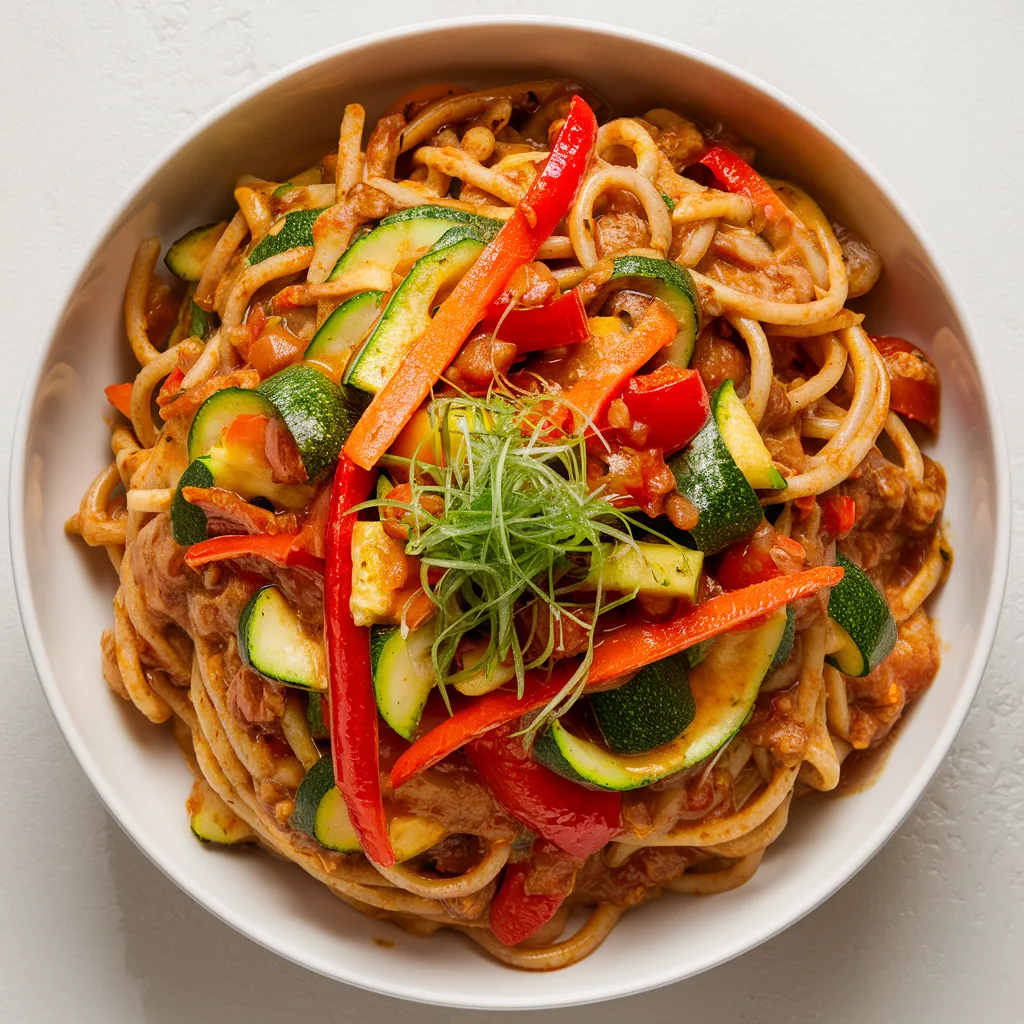 Por qué es bueno: La pasta integral aporta fibra y energía sostenida, mientras que las verduras añaden una gran cantidad de nutrientes y sabor.